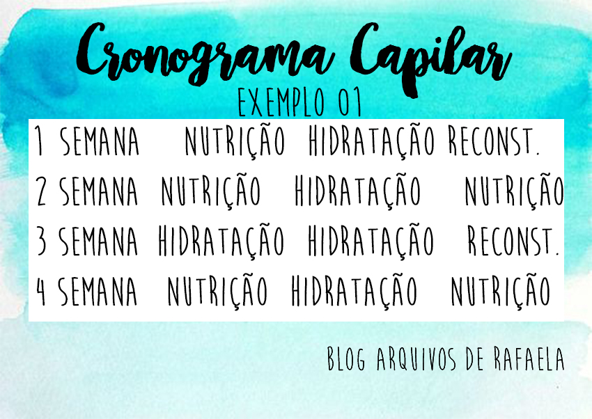 Primeiro você tem que saber o estado do seu cabelo. Se ele está muito seco, é melhor investir mais na nutrição. Se ele está elástico, com queda, aconselho reconstrução. E se ele está levemente ressecado, a hidratação. Eu vou deixar aqui exemplos de cronograma, mas você pode alterar e arrumar certinho conforme o seu cabelo precisa tudo bem?